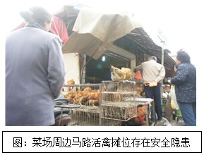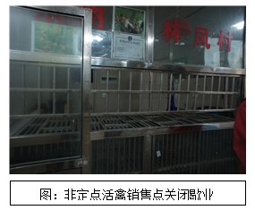 其中,三角地公司处于安全考虑2天内在下属17家菜场共处置活鸡1088只,活鸭287只,活鸽352只,并对非定点的10家家禽柜实行停业处理,7家具有资质的菜场全部亮证经营(三官塘)。但少数民营菜场和非标准化菜场,如三门、凉苑、广粤、沪陵、新高阳等菜场部分猪肉和活鸡摊位仍在销售政府明令禁止的问题猪肉和活禽、水禽产品。针对此情况,区商务委以责令上述市场管理方加以惩处,以儆效尤,要求摊位业主即时整改,及时销毁处理该类产品,消除安全隐患,做好场地清理工作。