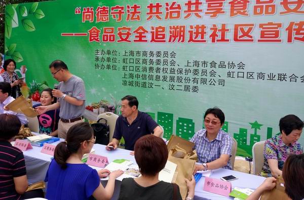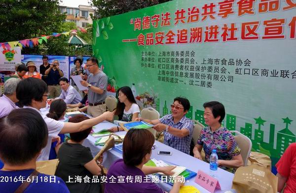 根据《国务院食品安全办等十八部门关于开展2016年全国食品安全宣传周活动的通知》和市食安办《关于上海市2016年食品安全宣传周活动方案的通知》有关要求,6月13日至27日举行2016年全国及上海市食品安全宣传周活动。近日,市商务委2016年食品安全宣传周主题日活动在虹口区凉城新村街道汶二社区、闵行区宝燕超市同步举行。市酒类专卖局、虹口区商务委、市食品协会、虹口区商联会、中信信息、质溯信息、光明乳业、菜博士、清美、明珠湖、嘉里食品、强丰、六和勤强、良友食品、上实农业、宝燕超市等相关单位参加此次活动。本次活动以“尚德守法共治共享食品安全”为主题,以“食品安全追溯进社区、进超市”为主线,通过专家讲解、追溯演示以及宣传品发放等方式,让食品追溯的理念走向基层、贴近生活。