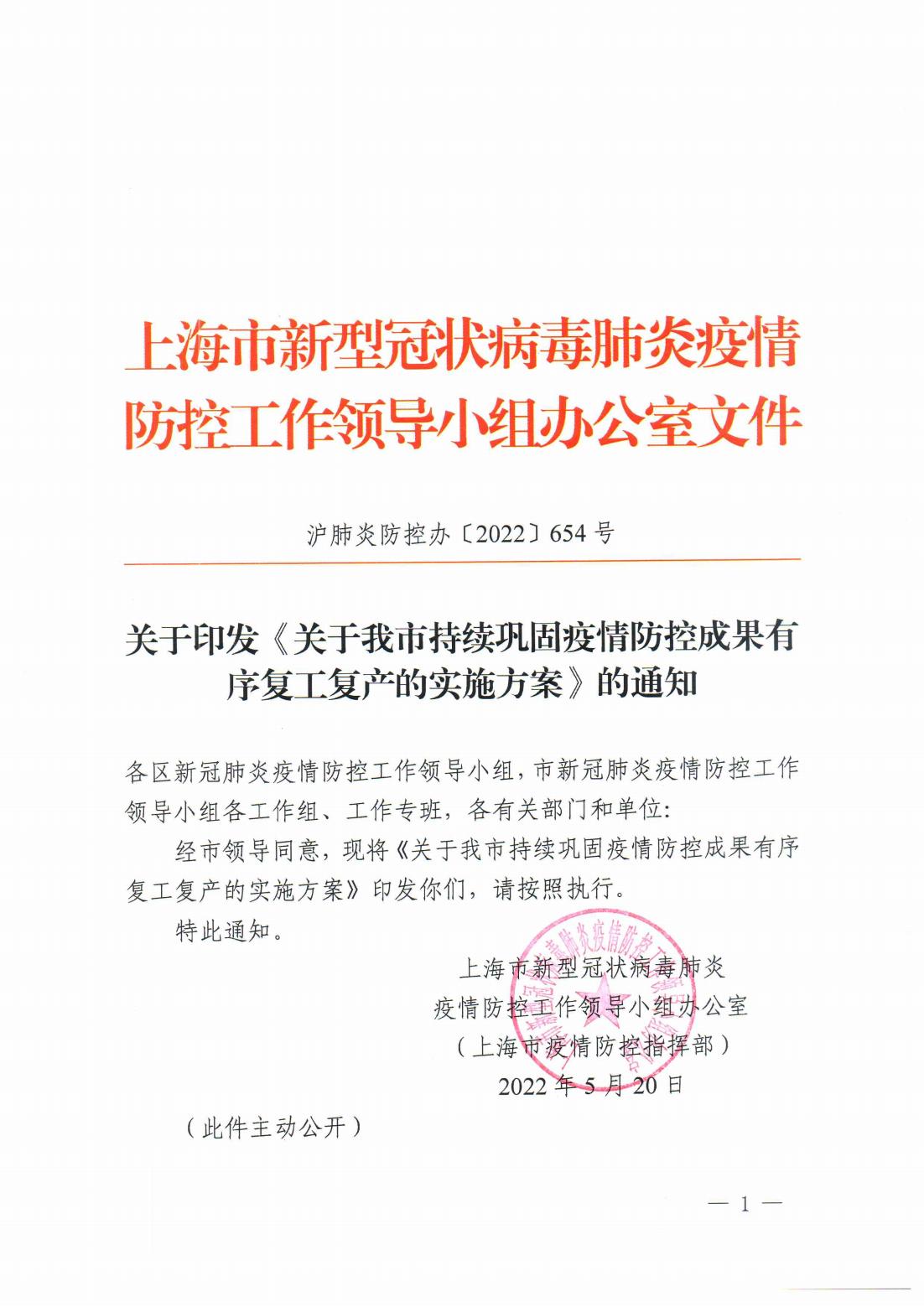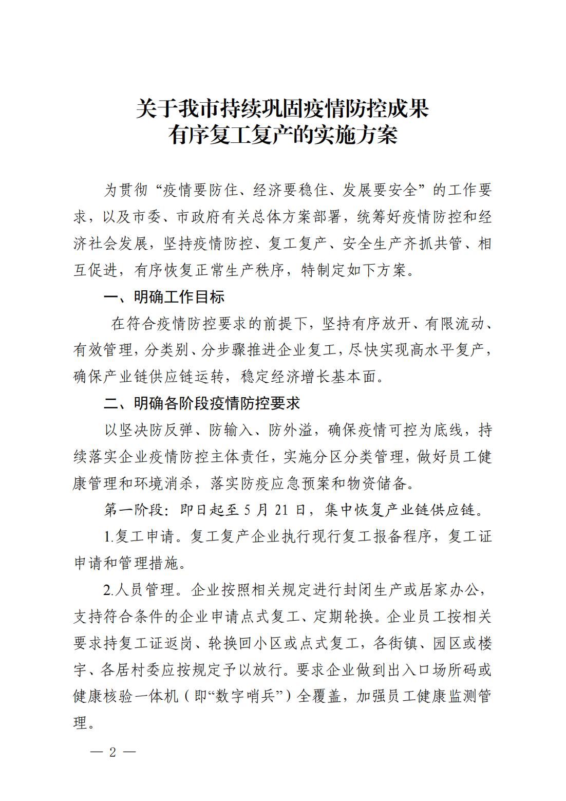 关于印发《关于我市持续巩固疫情防控成果有序复工复产的实施方案》的通知